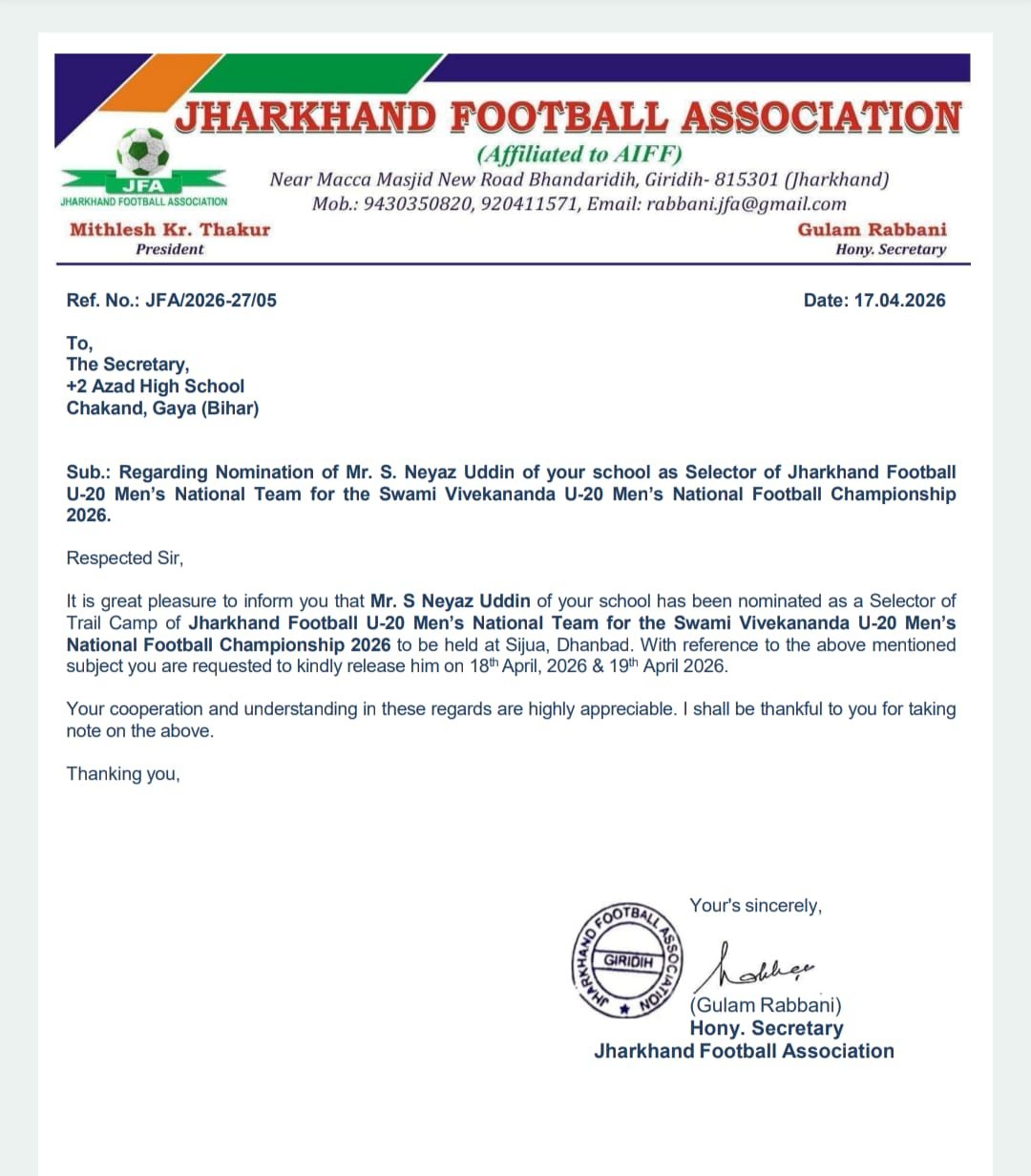 बेलागंज।+2 आज़ाद हाई स्कूल, चाकंद (गया) के प्राचार्य श्री एस. नेयाज़ उद्दीन को झारखंड अंडर-20 बालक राष्ट्रीय फुटबॉल टीम का मुख्य चयनकर्ता नियुक्त किया गया है। इस संबंध में जानकारी झारखंड फुटबॉल एसोसिएशन के महासचिव श्री गुलाम रब्बानी द्वारा विद्यालय के सचिव को पत्र के माध्यम से दी गई।