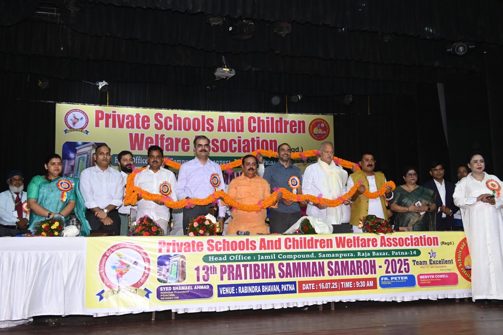 पटना ।प्राइवेट स्कूल्स एंड चिल्ड्रन वेलफेयर एसोसिएशन के तत्वाधान में 13वे प्रतिभा सम्मान समारोह का भव्य आयोजन बीर चंद पटेल पथ स्थित रविंद्र भवन के ऐतिहासिक सभागार में आयोजित किया गया। इस समारोह का उद्घाटन श्री कृष्णा अल्लावरू, प्रभारी बिहार प्रदेश कांग्रेस कमिटी,वरिष्ठ आई एस अधिकारी श्री दिवेश सेहरा, बिहार के चर्चित आई पी एस एवं आई जी श्री विकास वैभव,डॉ शकील अहमद खान लीडर CLP, एसोसिएशन के राष्ट्रीय अध्यक्ष शमायल अहमद,सेंट माइकल हाई स्कूल के प्राचार्य फादर क्रिस्टू, पूर्णिया की मेयर श्रीमती विभा कुमारी,एवं आई आई टी पटना के प्रोफेसर डॉ महेंद्र राम ने संयुक्त रूप से दीप प्रज्वलित कर किया।