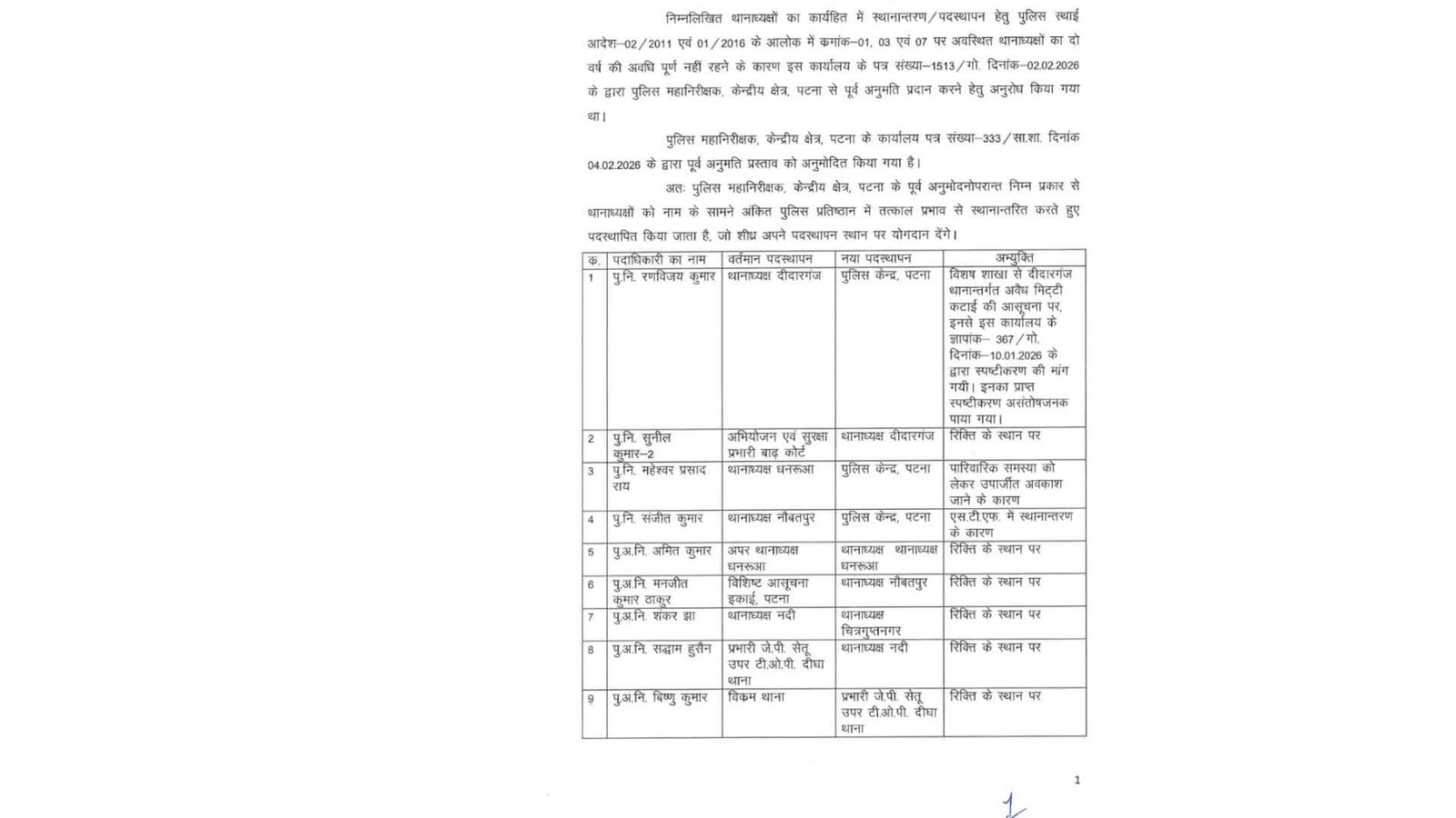 पटना के 9 पुलिस अधिकारियों का तबादला: दीदारगंज, धनरूआ और नौबतपुर समेत कई थानों को मिले नए थानाध्यक्ष