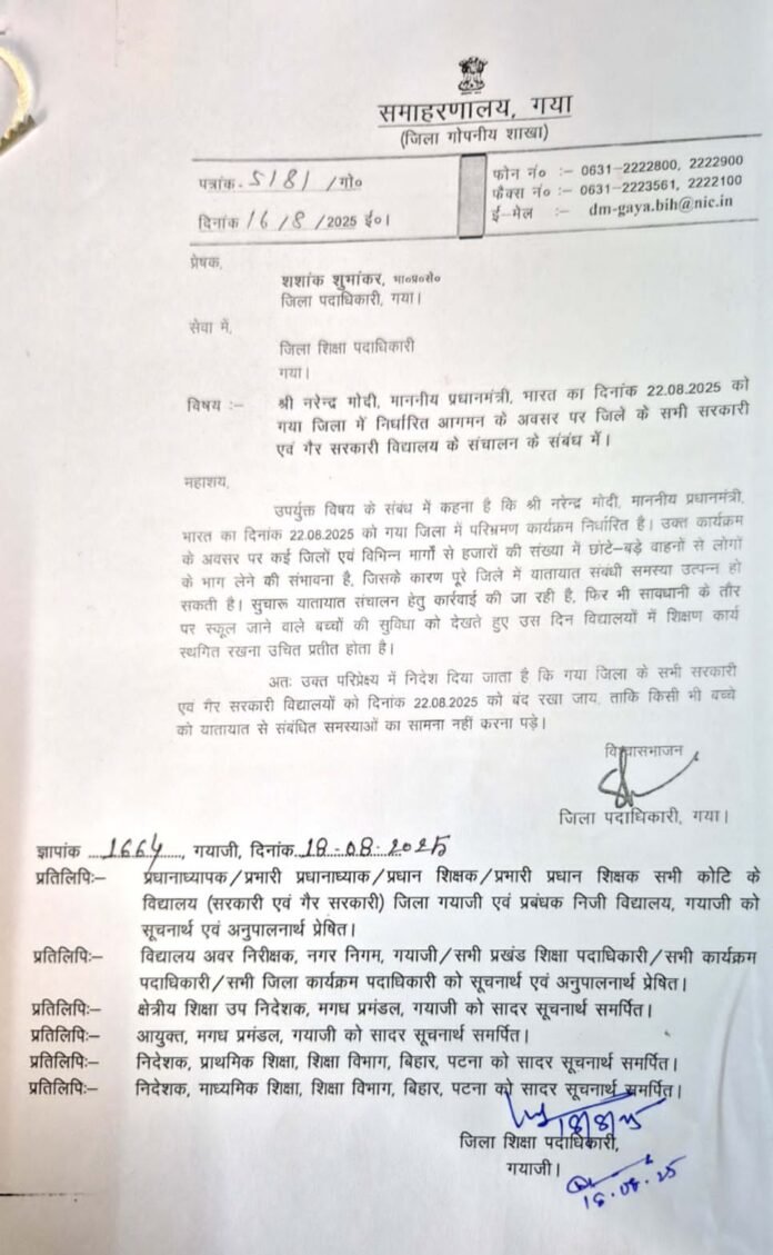 इस स्थिति को देखते हुए जिला पदाधिकारी शशांक शुभंकर ने आदेश जारी किया है कि दिनांक 22 अगस्त 2025 (शुक्रवार) को गया जिले के सभी सरकारी एवं गैर-सरकारी विद्यालय बंद रहेंगे।