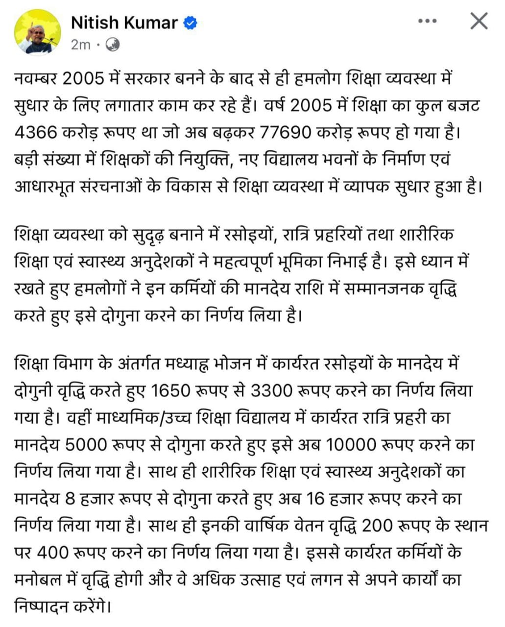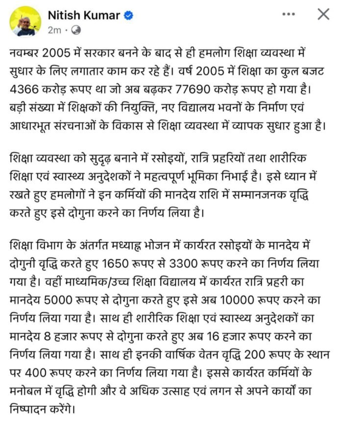 पटना।बिहार के मुख्यमंत्री नीतीश कुमार ने शिक्षा क्षेत्र में लगातार सुधार की दिशा में कई महत्वपूर्ण पहल की हैं। उन्होंने कहा कि 2005 में सरकार बनने के बाद से ही हम शिक्षा व्यवस्था में सुधार के लिए लगातार काम कर रहे हैं। उस समय शिक्षा का कुल बजट 4366 करोड़ रुपये था, जो अब बढ़कर 77,690 करोड़ रुपये हो गया है। साथ ही, बड़ी संख्या में शिक्षकों की नियुक्ति, नए विद्यालय भवनों का निर्माण और आधारभूत संरचनाओं के विकास से शिक्षा व्यवस्था में व्यापक सुधार हुआ है।