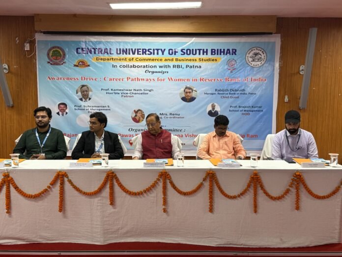 गयाजी।दक्षिण बिहार केन्द्रीय विश्वविद्यालय (सीयूएसबी) के डिपार्टमेंट ऑफ कॉमर्स एंड बिज़नेस स्टडीज और रिजर्व बैंक ऑफ इंडिया,पटना के संयुक्त तत्त्वाधान में एक विशेष संगोष्ठी सह जागरूकता कार्यक्रम का आयोजन किया गया | कुलपति प्रो कामेश्वर नाथ सिंह के संरक्षण में विवेकानंद सभागार में ‘ रिजर्व बैंक ऑफ इंडिया में महिला रोजगार के अवसर’ विषय पर इस जागरूकता कार्यक्रम का आयोजन किया गया | दीप प्रज्वलन के साथ कार्यक्रम की औपचारिक शुरुआत के पश्चात अतिथियों को स्मृति चिन्ह एवं शाल देकर स्वागत किया गया | अपना अध्यक्षीय वक्तव्य देते हुए माननीय कुलपति प्रो कामेश्वर नाथ सिंह ने कहा कि भारत सरकार महिलाओं को सशक्त करने के लिए विभिन्न योजनाओं को सामने ला रही है | मुझे इस बात की प्रसन्नता है कि सरकार के योजनाओं के अनुरूप रिजर्व बैंक ऑफ इण्डिया भी इस तरह के प्रोग्राम को संचालित करती है | यह हमारे देश का केन्द्रीय बैंक है.जहाँ रोज़गार प्राप्त कर हमारी छात्राएं अपने भविष्य को और बेहतर कर सकती हैं | कुलपति महोदय ने भविष्य में भी विशवविद्यालय परिसर में इस तरह के महत्वपूर्ण विषयों पर जागरूकता कार्यक्रम आयोजित करने की आवश्यकता पर बल दिया | जन संपर्क पदाधिकारी (पीआरओ) मोहम्मद मुदस्सीर आलम ने बताया कि मुख्य अतिथि के रूप में रिजर्व बैंक पटना के प्रबंधक रविजित देवनाथ ने रिजर्व बैंक से सम्बन्धित रोजगार के अवसरों को विस्तार से बताया | उन्होंने कहा कि महिलाओं की भागदारी जितनी ज्यादा होगी संस्था के लिए वो और भी अच्छा होगा | इस कार्यक्रम में गेस्ट ऑफ ऑनर के रूप में कुमार अभिषेक एवं विशिष्ट अतिथि के तौर पर धीरज कुमार शामिल हुए | इससे पहले स्कूल ऑफ मैनेजमेंट के डीन प्रोफेसर सुब्रमणयम श्न्मुगम के द्वारा सभी सम्मानित अतिथियों का स्वागत किया गया तथा उन्होंने विश्वविद्यालय प्रांगण में संगोष्ठी आयोजित करने पर आरबीआई, पटना के प्रति आभार प्रकट किया | स्वागत भाषण के पश्चात प्रोग्राम कोऑर्डिनेटर के रूप में विभाग की सहायक प्राध्यापिका श्रीमती रेणु ने आयोजन के स्वरूप को विस्तार से बताया | कार्यक्रम में एक क्विज प्रतियोगिता का आयोजन किया गया जिसमें सीयूएसबी की छात्राओं ने बढ़ चढ़कर हिस्सा लिया | विभागीय सहयोगी के रूप में डॉ. राजनारायणन,डॉ. रचना विश्वकर्मा,डॉ. पावस कुमार,डॉ. प्रदीप राम का महत्वपूर्ण सहयोग रहा | इस अवसर पर विश्वविद्यालय की वित्त अधिकारी श्रीमती रश्मि त्रिपाठी,उपकुलसचिव प्रतिश कुमार दास,सहायक कुलसचिव शशि रंजन, अर्थशास्त्र विभाग के एसोसिएट प्रोफेसर डॉ अबोध कुमार, डिपार्टमेंट ऑफ साइकोलॉजिकल स्टडीज से डॉ चेतना जायसवाल,अंग्रेजी विभाग से डॉ अर्पणा झा, इनफार्मेशन साइंटिस्ट क्षितिज सिंह, सहायक अ