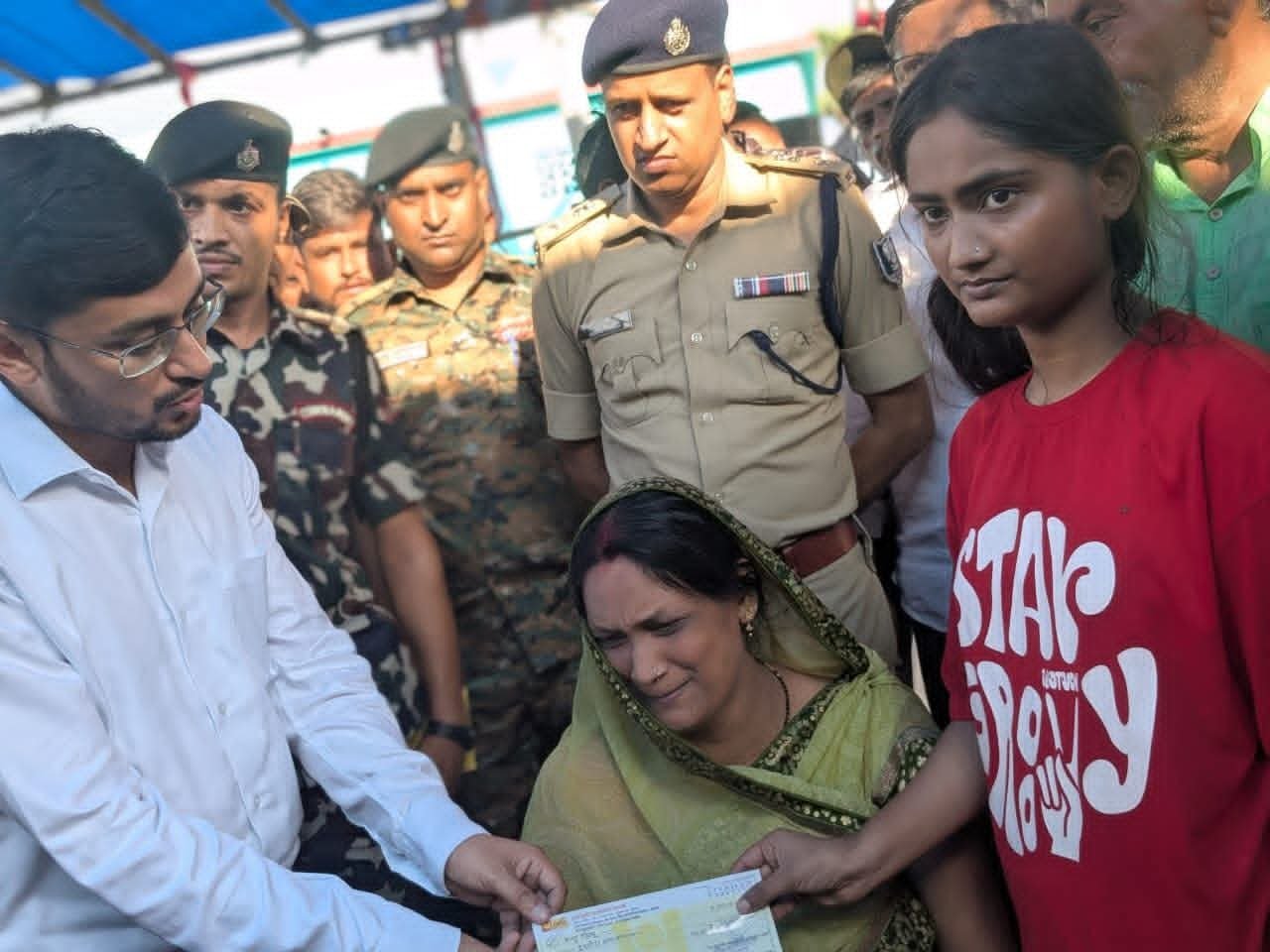 डीएम एसएसपी  ने शहीद के गाँव पहुँचकर परिजनों से की भेंट ,  शहीद की पत्नी को सौंपा 21 लाख का चेक