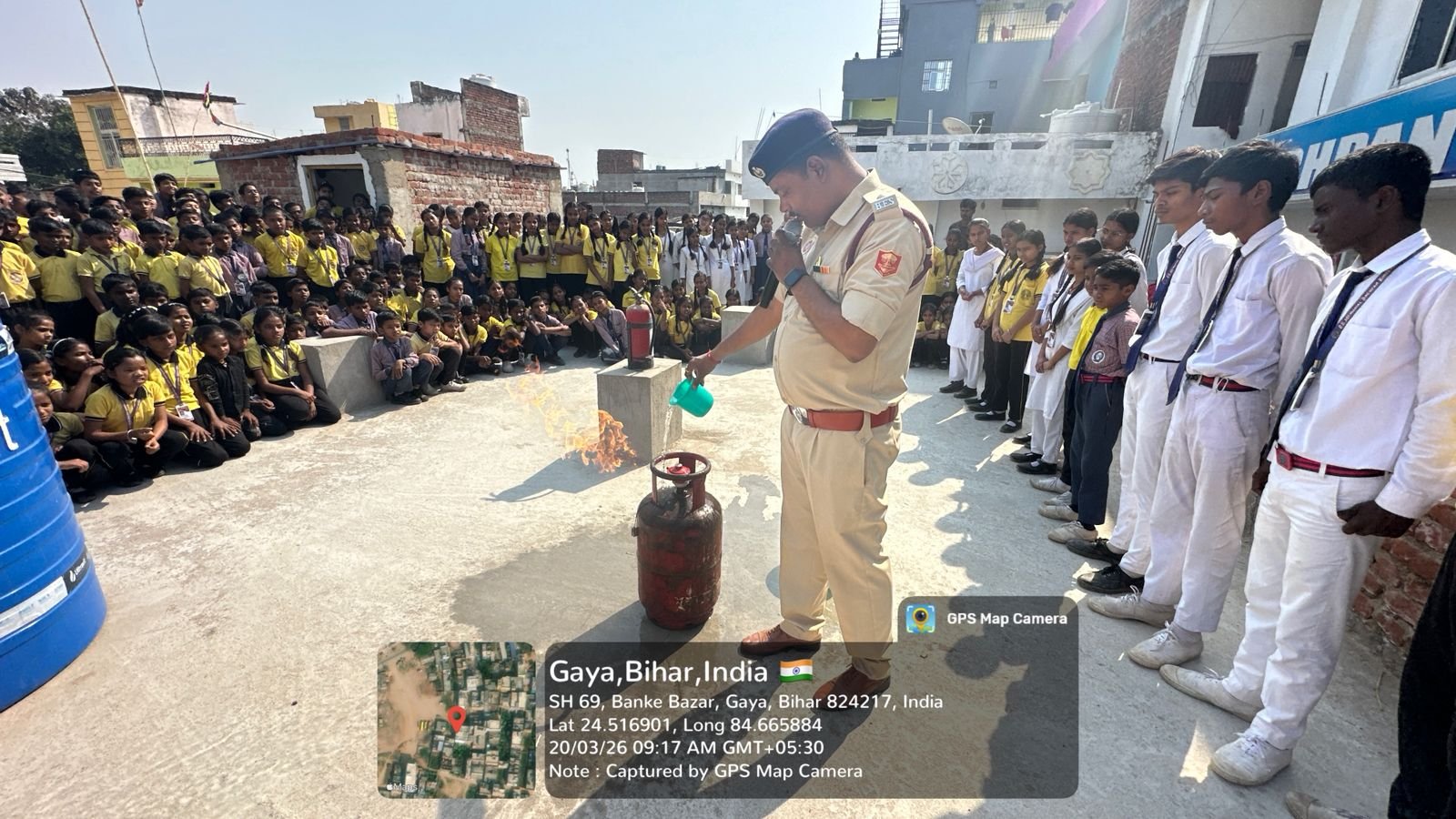 सहायक अग्निशमन पदाधिकारी राणा प्रवीण सिंह ने आग लगने की स्थिति में धैर्य बनाए रखने और बचाव के उपाय बताए। टीम ने गैस सिलेंडर व शॉर्ट सर्किट से लगी आग बुझाने का प्रदर्शन किया। विद्यार्थियों ने सवाल पूछकर जानकारी हासिल की।