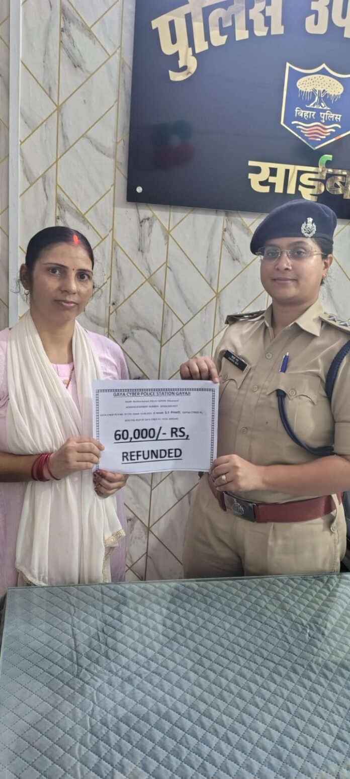 गया।गया पुलिस ने साइबर अपराध के खिलाफ एक बड़ी सफलता हासिल की है। जिले की महिला रेशमा कुमारी के खाते से धोखाधड़ी कर निकाले गए ₹60,000/- की पूरी राशि पुलिस ने वापस करा दी।