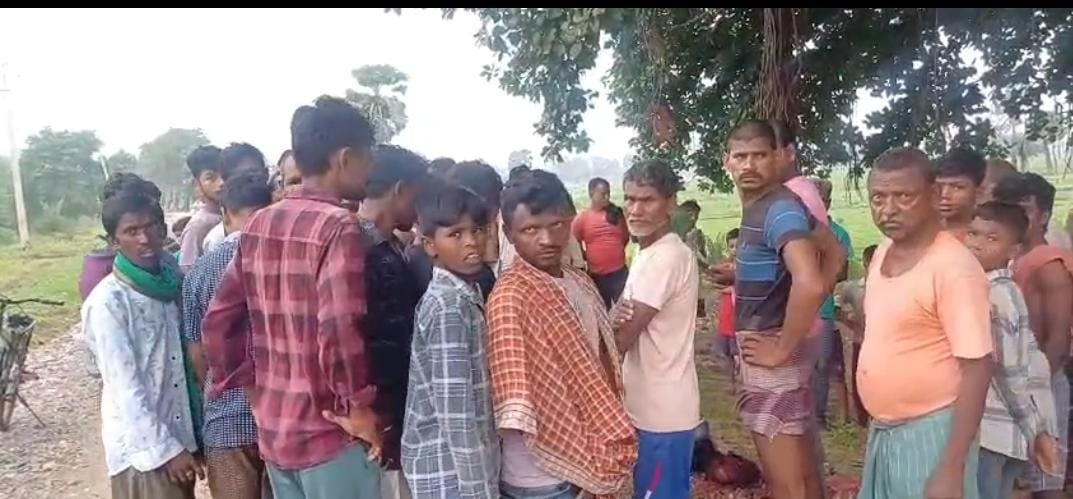 फोटो :- वजीरगंज के पतेड़ – तेलबिगहा रोड में रविवार की सुबह शव के पास खड़ी पुलिस एवं उसे देखते ग्रामीणों की भीड़