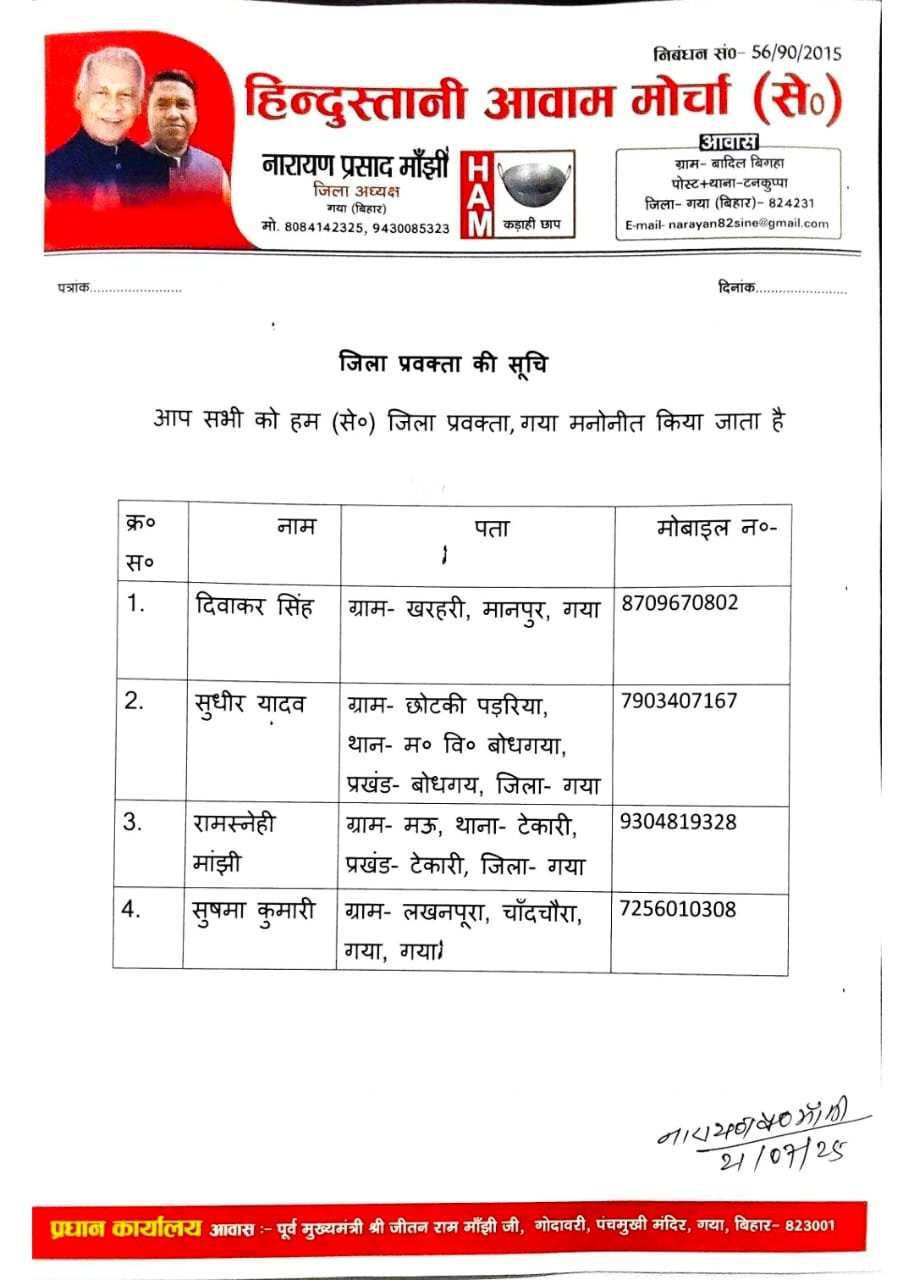 गयाजी।हिन्दुस्तानी आवाम मोर्चा (से०) की गया जिला इकाई ने संगठन को मजबूत करने की दिशा में अहम कदम उठाते हुए जिले के चार प्रवक्ताओं की घोषणा की है। यह सूची जिला अध्यक्ष नारायण प्रसाद मांझी द्वारा जारी की गई है।