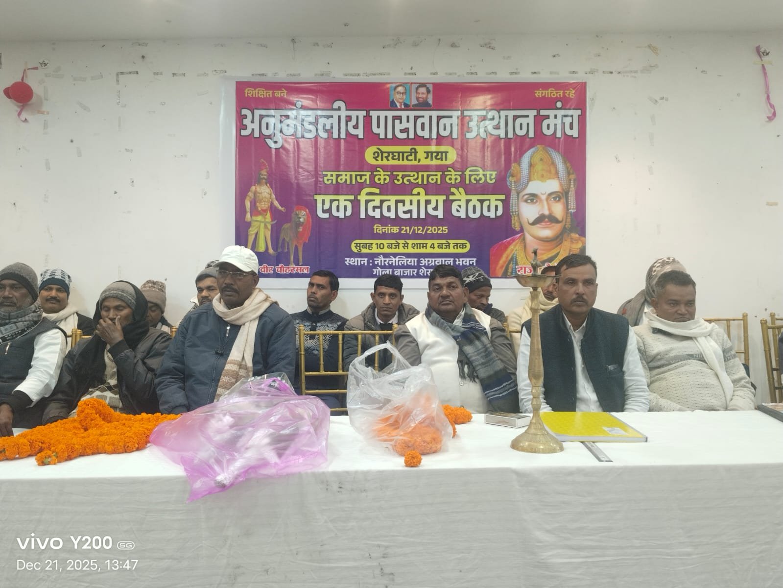 शेरघाटी।अनुमंडलीय पासवान उत्थान मंच के द्वारा रविवार को शहर के नारनौलिया अग्रवाल भवन में एक दिवसीय बैठक का आयोजन किया गया। बैठक की अध्यक्षता अनुमंडल अध्यक्ष बबन पासवान ने की। इसमें शेरघाटी अनुमंडल क्षेत्र के विभिन्न प्रखंडों से बड़ी संख्या में समाज के लोग शामिल हुए।