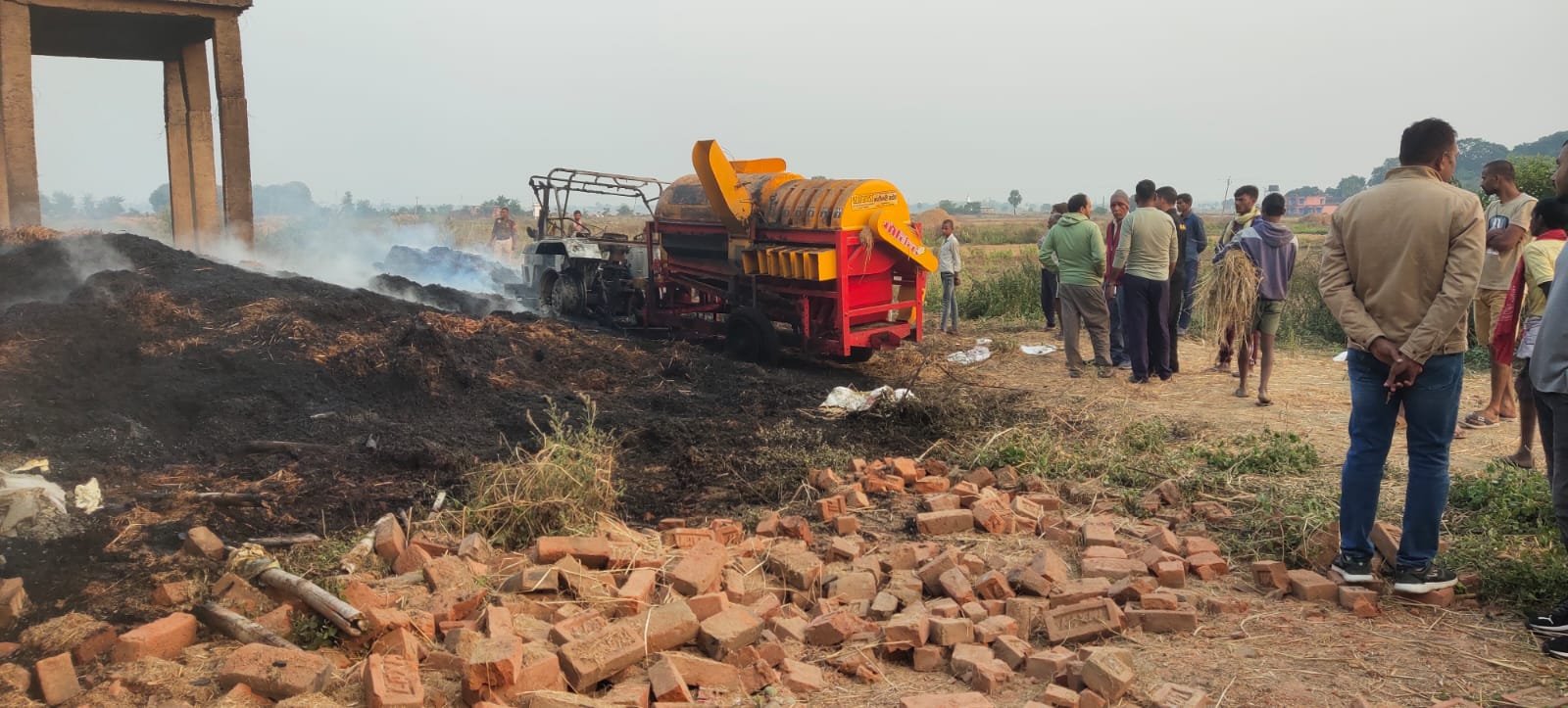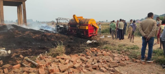 सेलवे गांव में धान झाड़ रहे ट्रेक्टर में आग लगने से ट्रेक्टर समेत धानका एक हजार बोझा जलकर हुआ राख