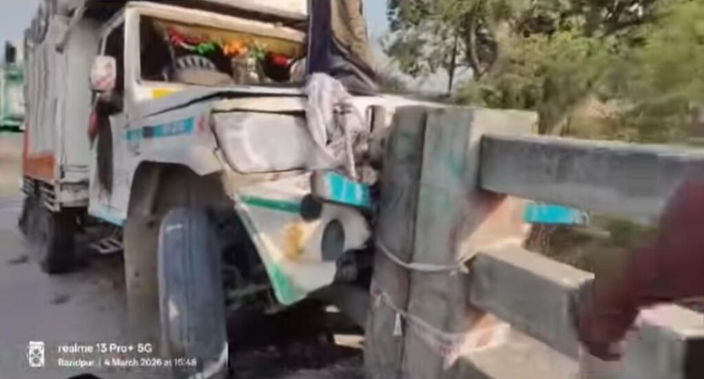 कोंच/आमस। संवाददाता: आमस थाना क्षेत्र के करमाइन मोड़ के समीप राजापुर पुल के पास बुधवार दोपहर एक भीषण सड़क हादसे में दो लोगों की मौत हो गई, जबकि तीन अन्य गंभीर रूप से घायल हो गए। हादसा दोपहर करीब 3:51 बजे हुआ, जब तेज रफ्तार पिकअप अनियंत्रित होकर जीटी रोड के डिवाइडर से जा टकराई।