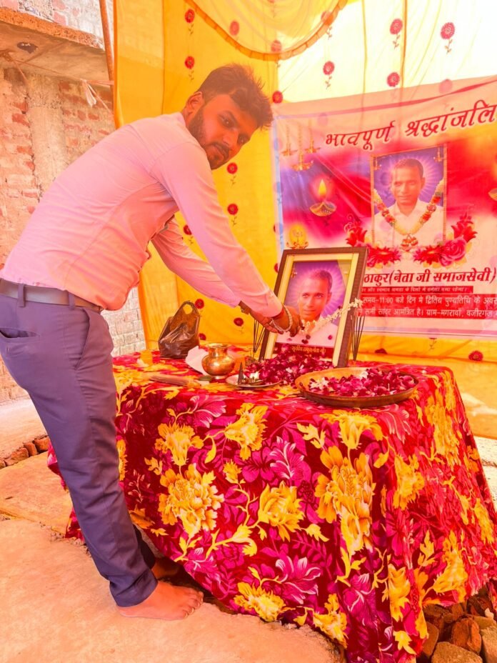 वजीरगंज।कांग्रेस नेता सह नंदवंशी चेतना मंच के सदस्य व समाजसेवी स्व सूर्यदेव शर्मा की द्वितीय पुण्यतिथि के अवसर पर रविवार को प्रखंड के पतेड़ स्थित आवास पर श्रद्धांजलि सभा का आयोजन उनके पुत्र अरुण शर्मा के देखरेख में किया गया |सभा में उपास्थित प्रबुद्धजनों ने स्व सूर्यदेव शर्मा की तस्वीर पर माल्यार्पण करते हुए दीप प्रज्वलित किया एवं इनके सामाजिक कार्यों की चर्चा की |कार्यक्रम के मुख्य अतिथि कांग्रेस नेता सह वजीरगंज विधानसभा क्षेत्र के भावी प्रत्याशी डॉ शशि शेखर सिंह ने कहा कि स्व सूर्यदेव शर्मा कांग्रेस के सक्रीय कार्यकर्ता थे एवं समाज के उत्थान के लिये समर्पित थे |इनके द्वारा अपने समाज के लिये किये गये कल्याणकारी कार्यों के लिये सदा याद किये जाएंगे ।इस मौके पर पंचायत मुखिया राजीव रंजन कुमार उर्फ डब्लू यादव ,सरपंच महेश कुमार सुमन , जिला पार्षद छोटू दास,नंदवंशी चेतना मंच के जिला उपाध्यक्ष मिथलेश शर्मा ,प्रखंड अध्यक्ष मनोज शर्मा ,सदस्य अमरेश शर्मा ,प्रदीप शर्मा ,डॉ राजीव ठाकुर सहित कई गण्यमान्य लोग मौजूद थे।