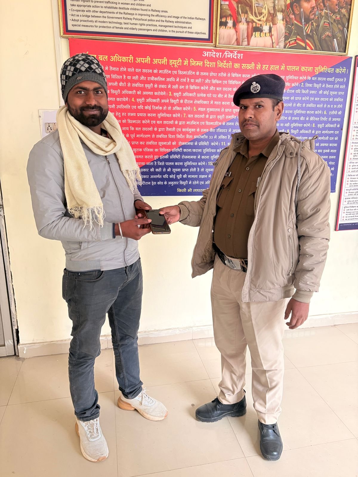 गयाजी।उ.नि. जावेद एकबाल साथ प्र० आ० संजय कुमार राय, आ० अमित कुमार एवं आ० अनील प्रसाद रेलवे सुरक्षा बल पोस्ट गया के द्वारा गया स्टेशन परिसर के प्लेटफॉर्म नंबर 6/7 के मिडल FOB के पास आपराधिक गतिबिधी के निगरानी के दौरान समय करिब 04:15 बजे एक मोबाईल प्लेटफॉर्म नंबर 7 के ट्रैक मे गिरा हुआ दिखाई दिया। तत्पश्चात प्लेटफॉर्म नंबर 6/7 पर मौजूद यात्रियों से घूमकर पूछताछ करने पर किसी भी यात्री ने अपना होना नहीं बताया थोरी देर बाद उसी मोबाईल पर कॉल आया जिसने अपना नाम अनुपम कुमार उम्र 26 वर्ष पिता यमुना सिंह पता कमालपुर थाना बरहरी जिला रोहतास बिहार बताया तथा बताया कि गाड़ी मे चढ़ने के दौरान उनका मोबाईल गिर गया है और यह उन्ही का मोबाईल है। तब उन्हे बताया गया की उनका मोबाईल रेलवे सुरक्षा बल पोस्ट गया मे सुरक्षित रखा गया है उचित दस्तावेज के साथ आकर अपना मोबाईल प्राप्त कर सकते है। सूचना उपरांत यात्री अनुपम कुमार रेलवे सुरक्षा बल पोस्ट गया पर उचित दस्तावेज के साथ पहुंचे तो उन्हे मोबाईल दिखाया तो उनके द्वारा देखते ही अपने खोए हुए मोबाईल के रूप मे पहचान किए तब उनसे मोबाईल का लॉक खोलने को बोल गया तो उनके द्वारा लॉक खोल दिया गया जिससे स्पष्ट हुआ की ये उनका ही मोबाईल है जो आसमानी रंग का विवो कंपनी का मोबाईल है । उनके द्वारा उचित दस्तावेज प्रस्तुत किया गया जिसके सत्यापन उपरांत उनको उनका उपरोक्त मोबाईल सही सलामत सुपुर्द किया गया। जिसका किमत यात्री द्वारा 22000/- रुपया बताया गया। इसके लिए यात्री ने रेलवे सुरक्षा बल को धन्यवाद दिया।